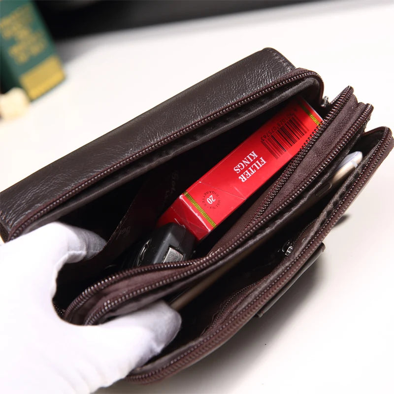 This men's leather fanny pack is perfect for carrying your cell phone, money, keys, and even cigarettes. It features a stylish design and ample storage space.