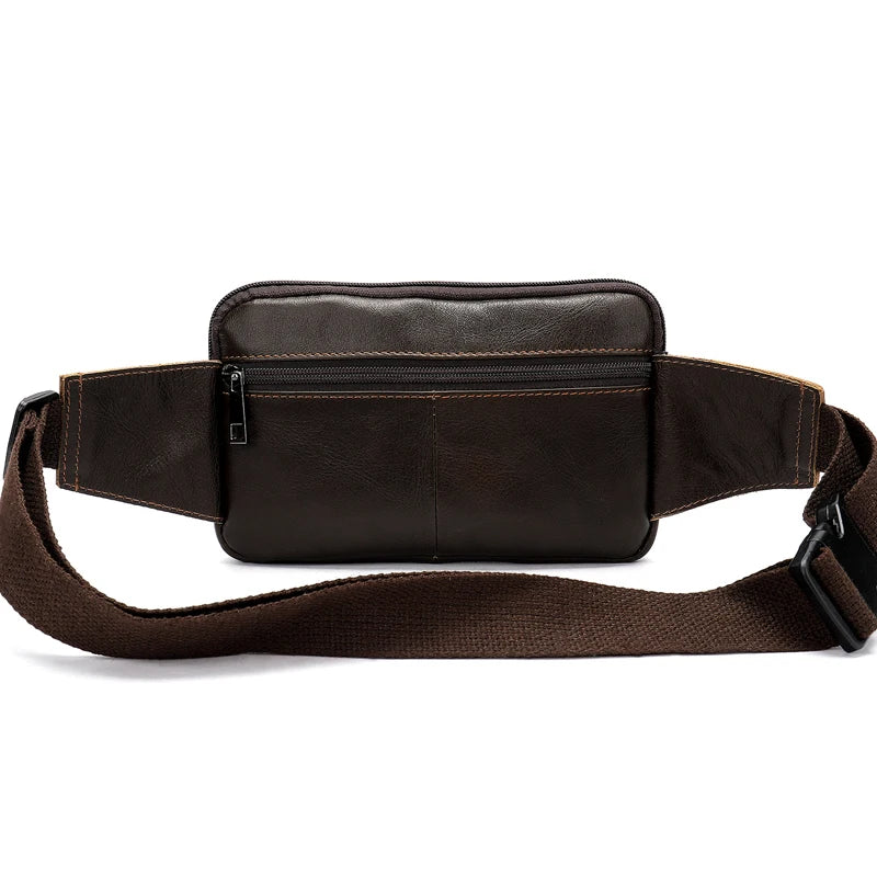 This men's leather waist bag is made of top cowhide leather, perfect for carrying your essentials. It features multiple compartments and can be worn as a shoulder or crossbody bag.