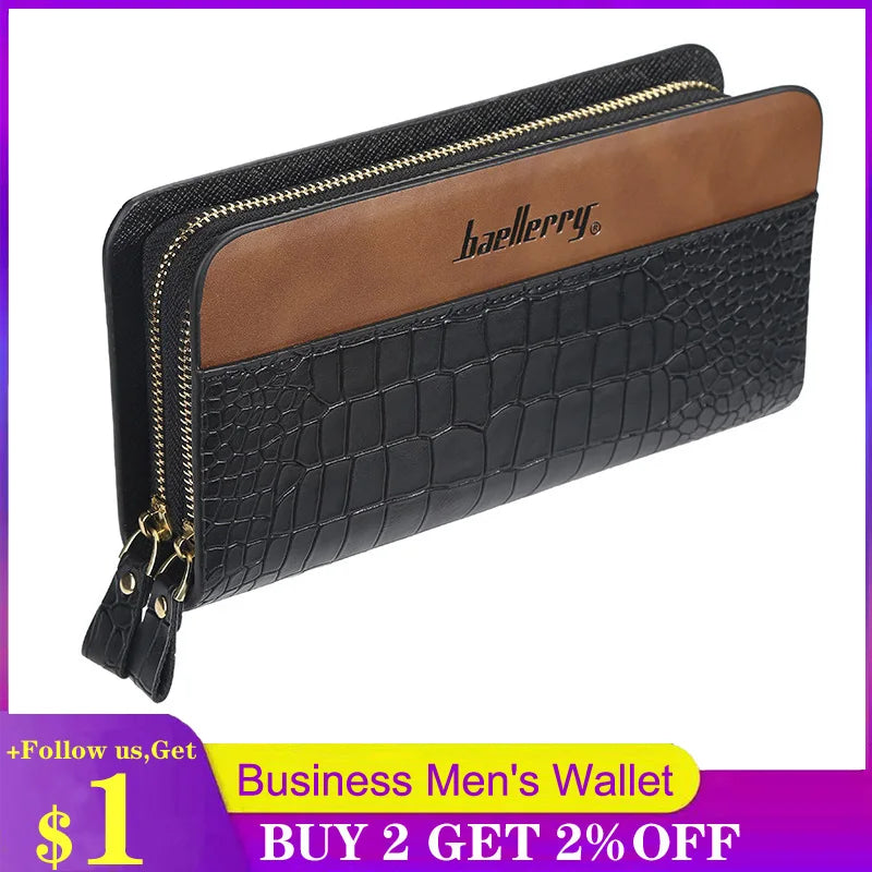 This men's business long wallet is made of high-quality leather with a crocodile stripe design. It features a phone pocket and double zipper for added security. Ideal as a gift for males.