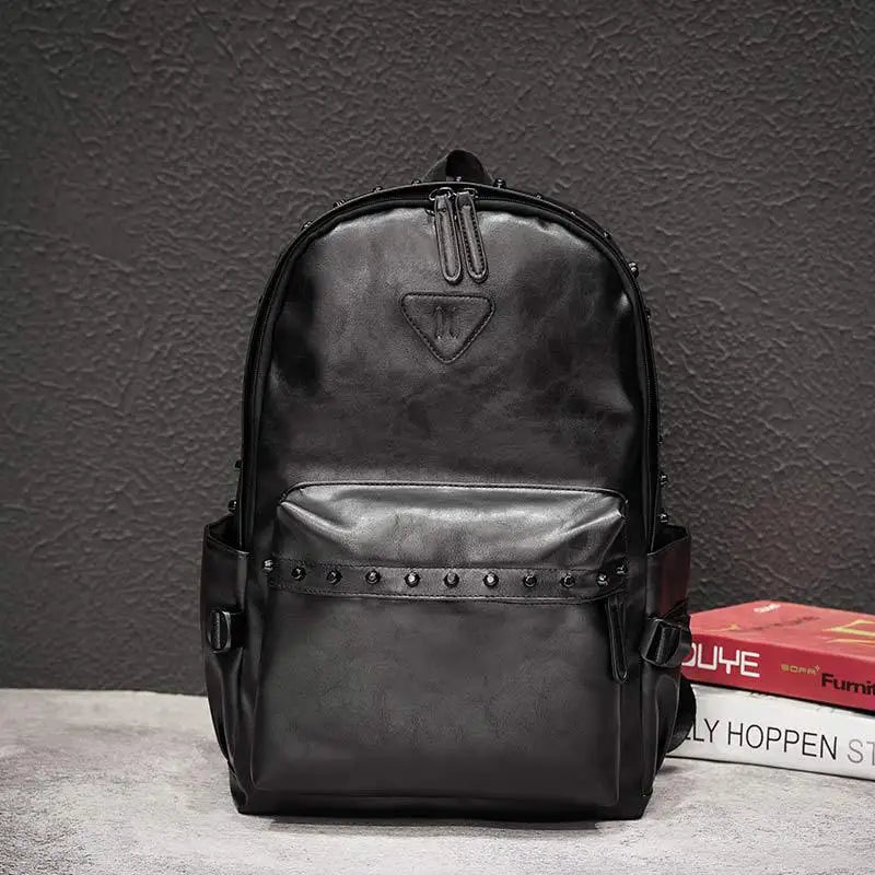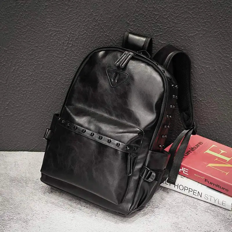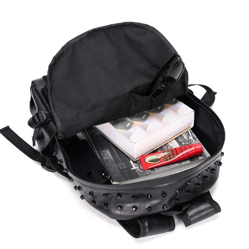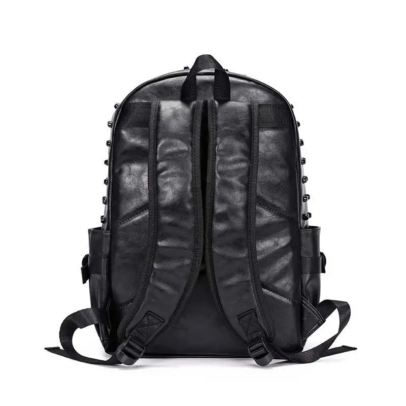 This street style backpack features rivets, high capacity design, and made of PU leather. Perfect for students and travel.