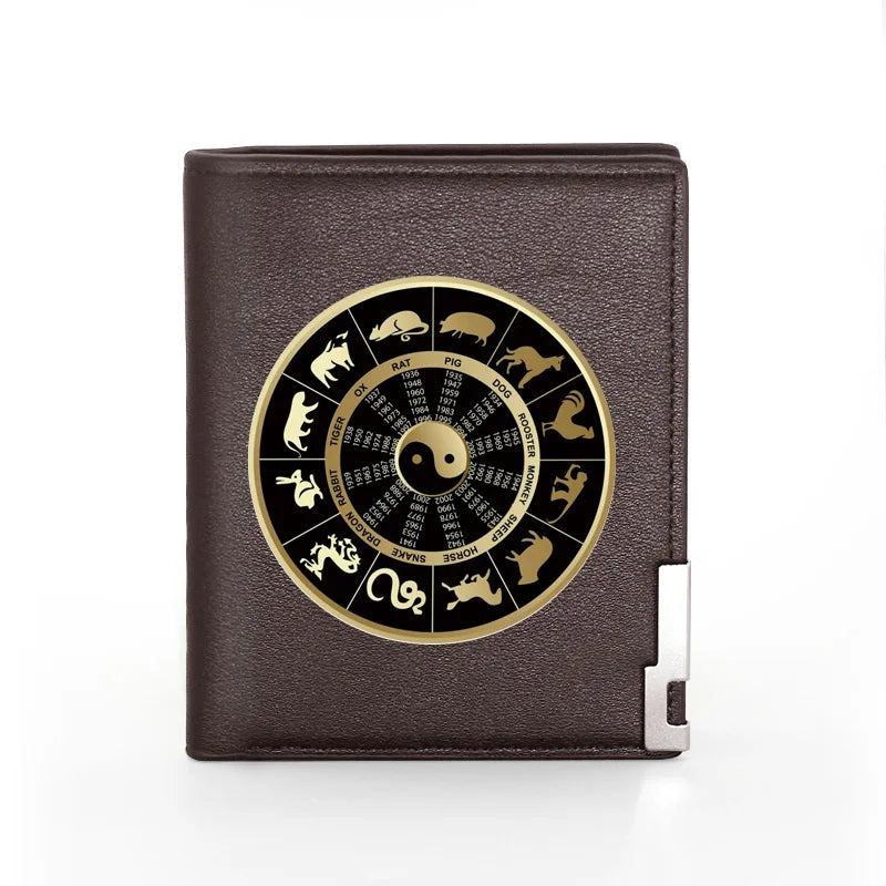 This men's wallet features 12 symbolic animals printing on leather. It includes credit card/ID holders, inserts for money, and a pocket for short purses.