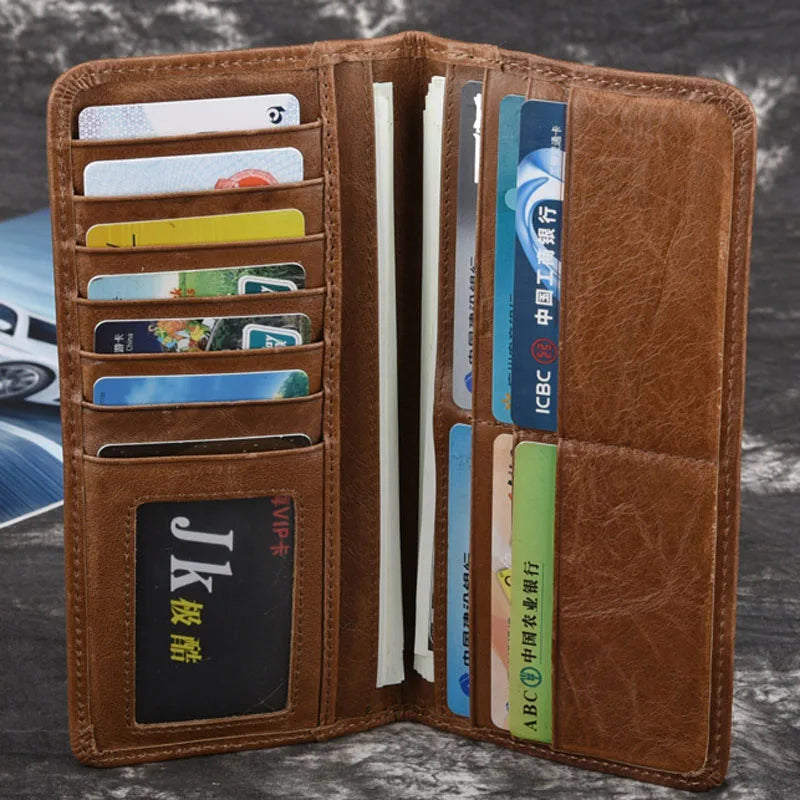 This men's first layer cowhide wallet features a retro design with oil wax cowhide leather, perfect for storing coins and multiple cards.