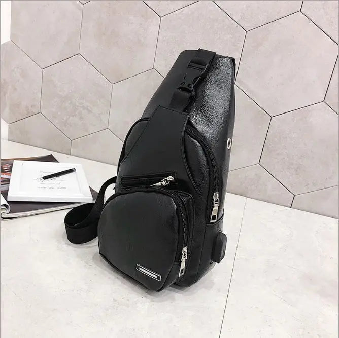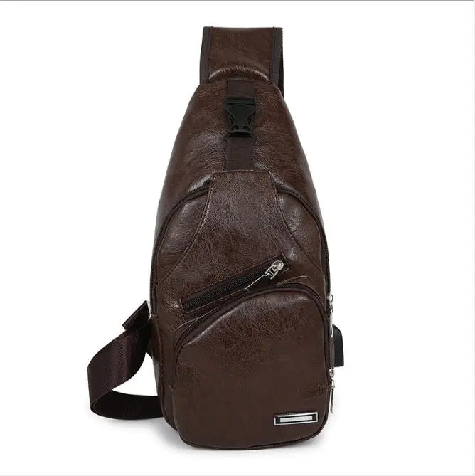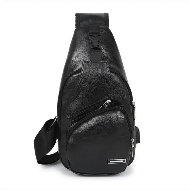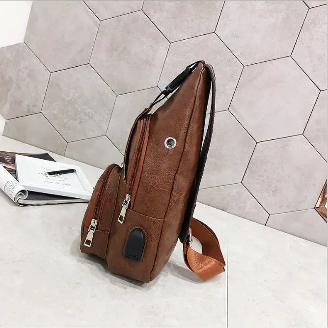 Men's Leather Chest Bag USB Charging Waterproof Crossbody Bag