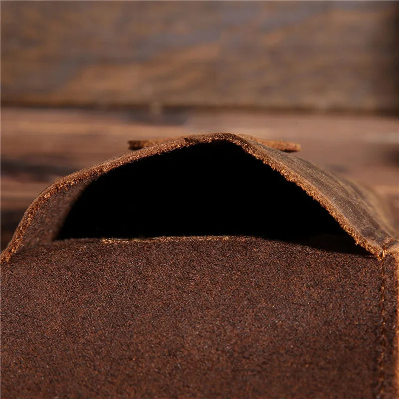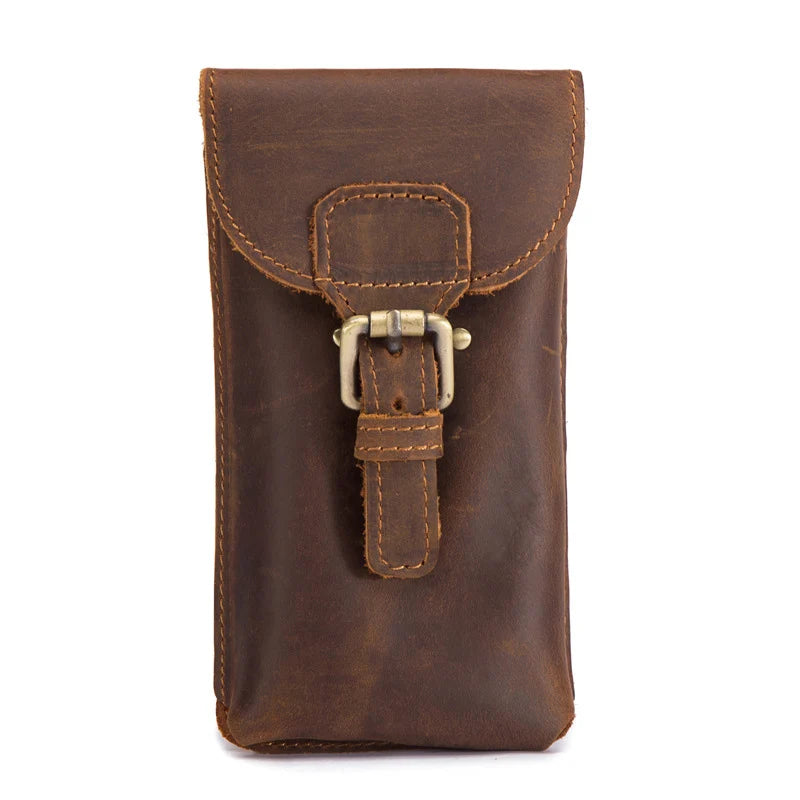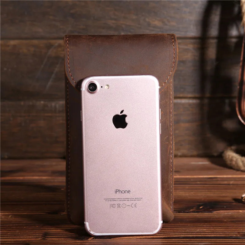 This men's leather fanny waist pack is a stylish and functional accessory. It features a small mini cell/mobile phone pocket and a hook for easy carrying. Made of high-quality leather, this vintage bag is perfect for carrying money and other essentials.