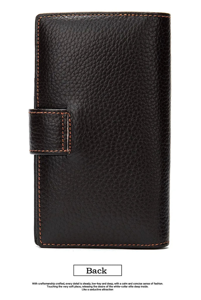 This men's long wallet is made of high-quality cow leather with a hasp closure. It features a trifold design, multiple card slots, a large cash compartment, and a phone pocket. Perfect for business and everyday use.
