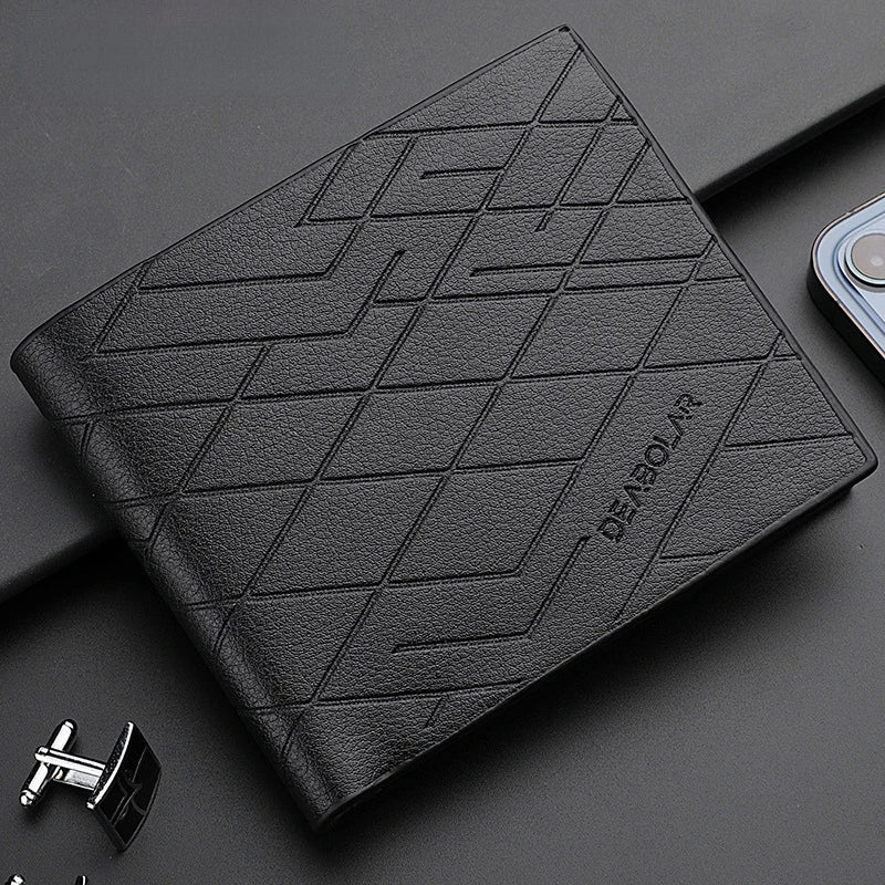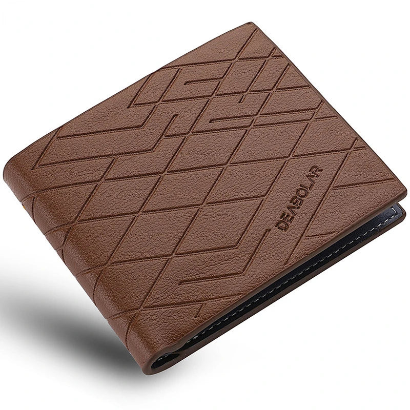This men's short wallet is made of PU leather, perfect for everyday use. It features multiple card slots, a coin pocket, and a cash compartment.
