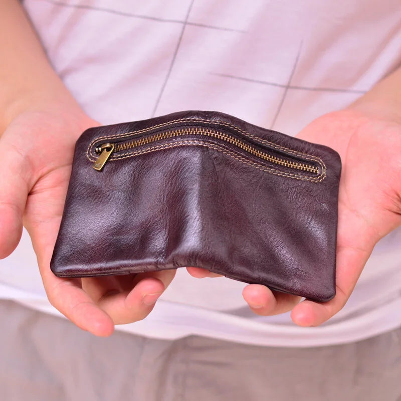Men's Thin Leather Zipper Wallet, Mini Cowhide Wallet