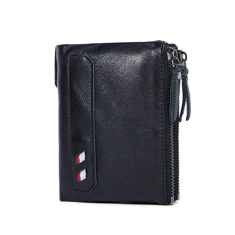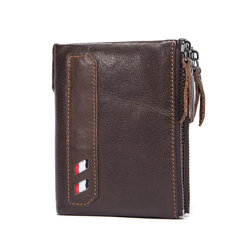 Keep your cash and cards organized in this stylish men's leather wallet. With a retro design, double zipper closure, and hand holding feature, this wallet is both functional and fashionable.