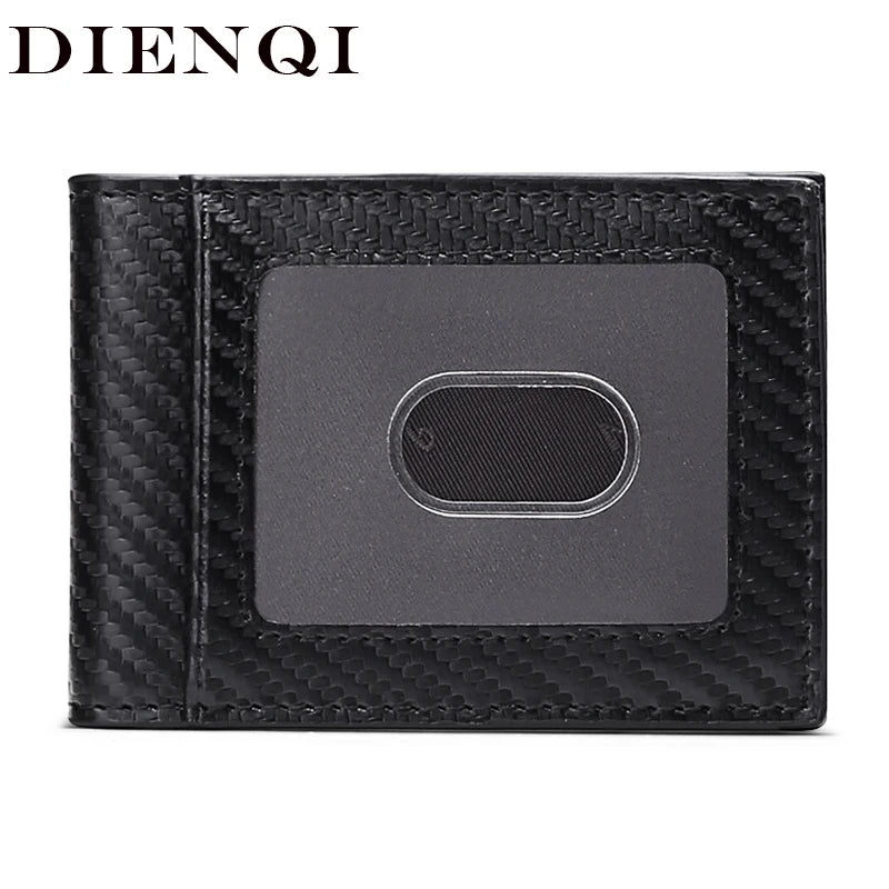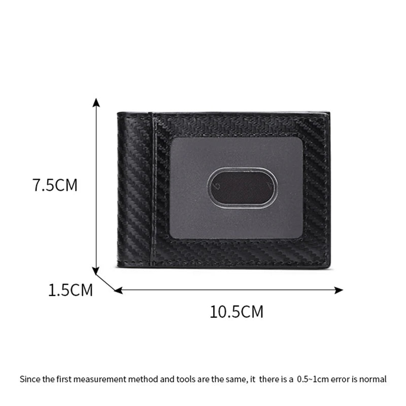 This men's wallet is crafted from carbon fiber leather and features RFID protection. It is slim, thin, and includes a money clip for added convenience.