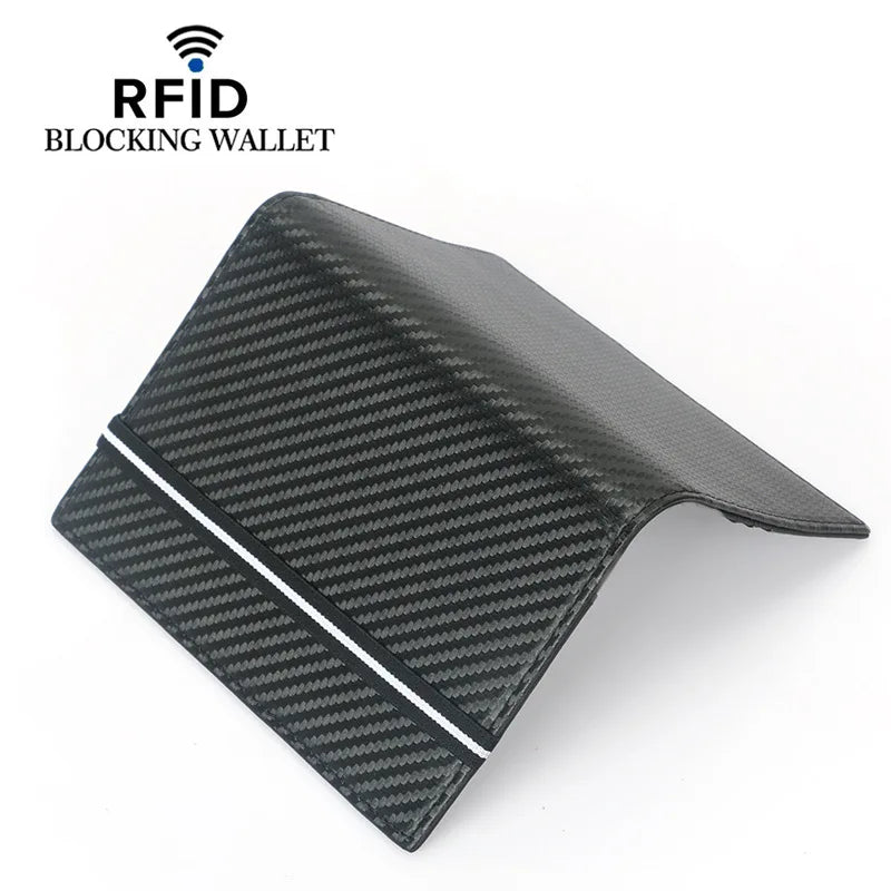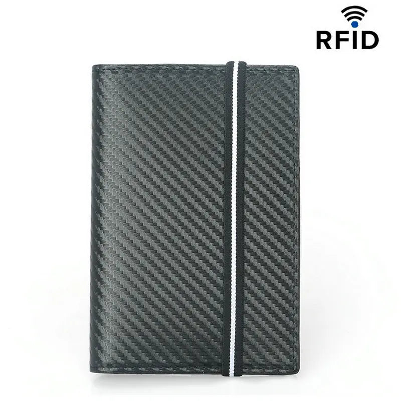 Protect your passport in style with this RFID passport cover featuring carbon fiber microfiber and leather construction. Includes elastic band for secure closure.