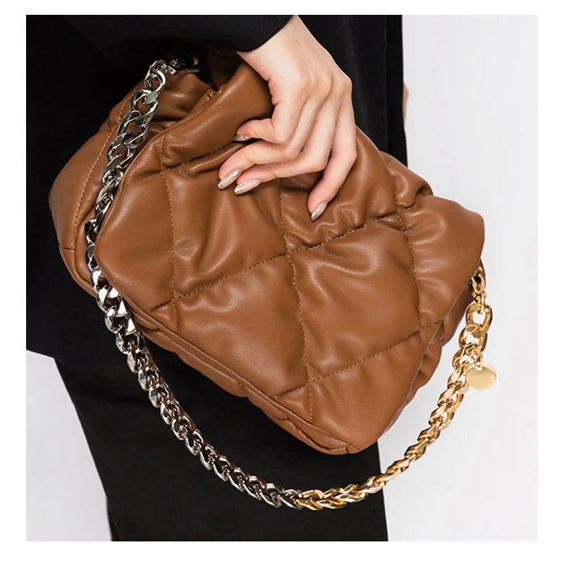This ladies diagonal bag features rhombus embroidery and chain design. It exudes feminine temperament and is versatile for all occasions.