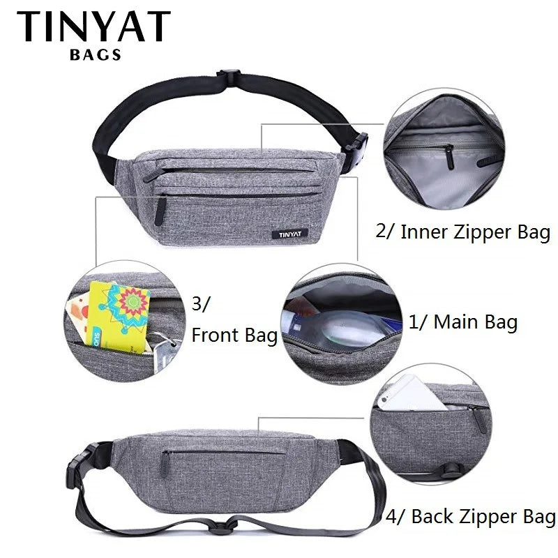TINYAT Men Waist Bag Casual Fanny Pack Money Phone Belt Gray Nylon Bum Bag