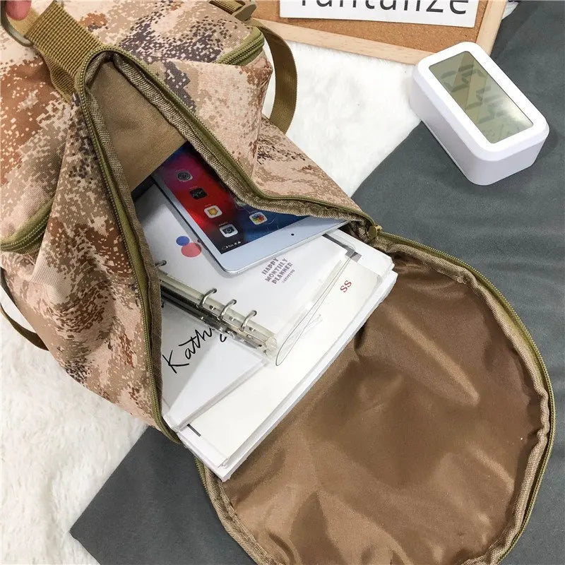This vintage canvas backpack is perfect for casual travel, school, or work. It features a convenient bucket design with ample space for a laptop and other essentials.