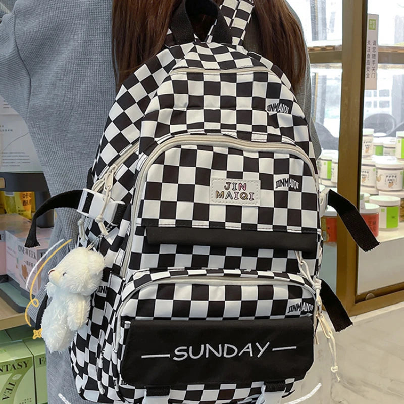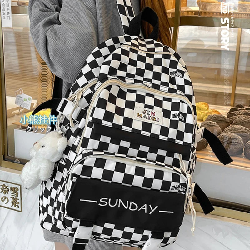 This stylish schoolbag is perfect for junior high and high school girls. It features a grid design and offers a large capacity for books and a laptop.