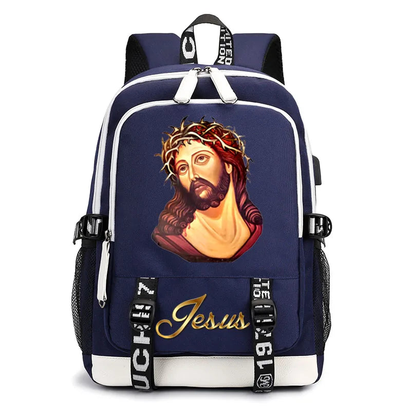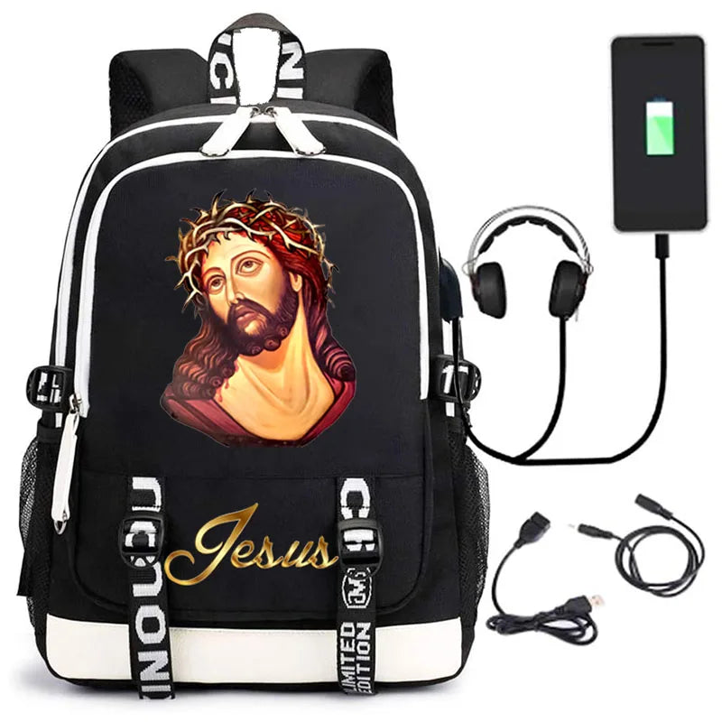 This stylish and functional backpack is perfect for school, travel, or everyday use. It features a unique Jesus cartoon design and comes with a built-in USB charging port.