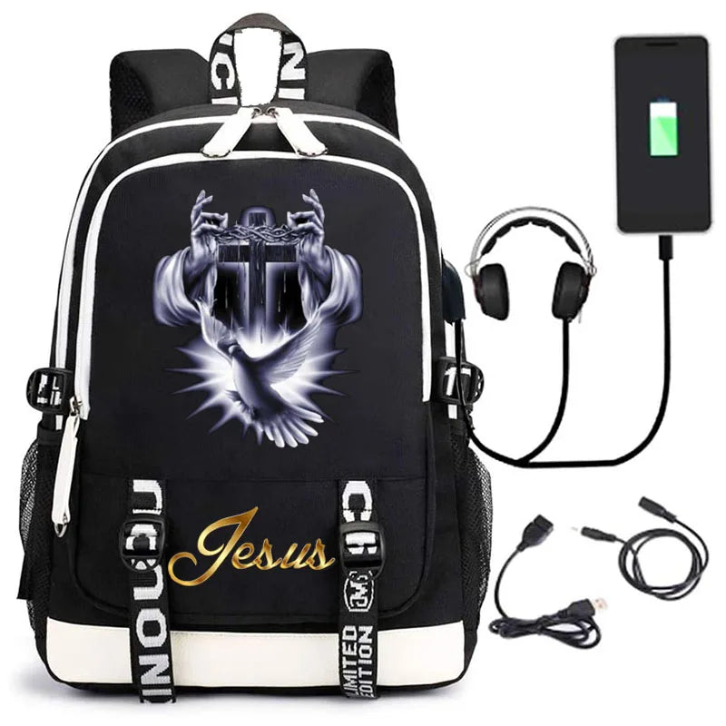 Jesus Cartoon USB Backpack School Bag for Boys and Girls