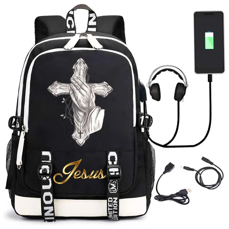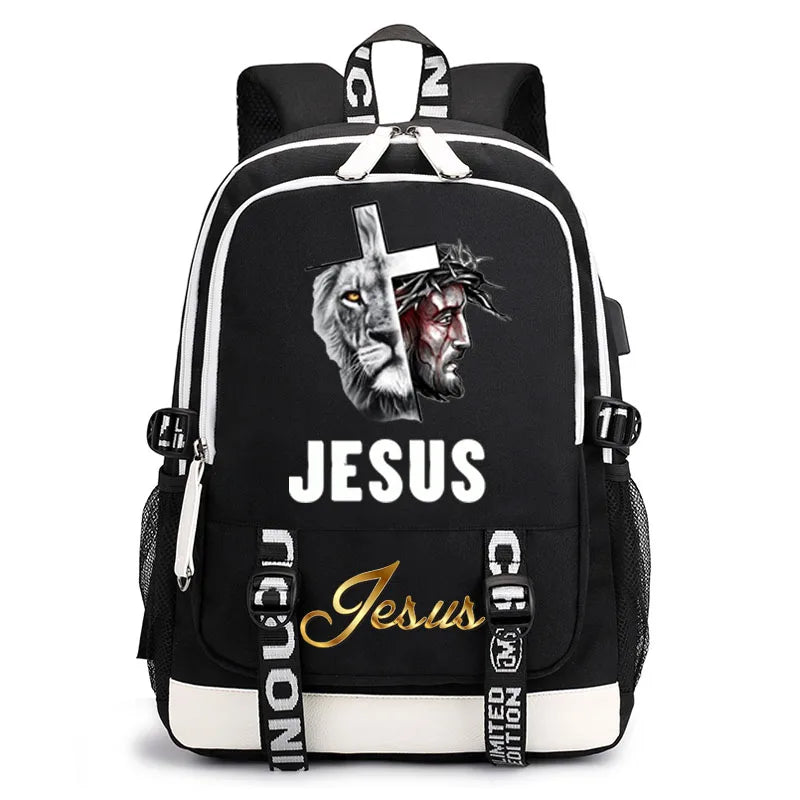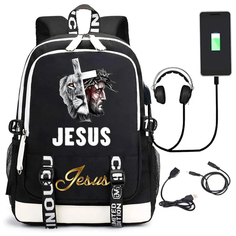 This stylish and practical backpack features a Jesus cartoon design, USB charging port, suitable for boys, girls, ladies, and men for school or travel.