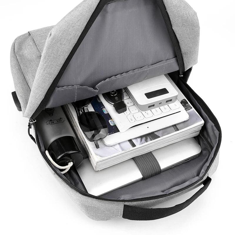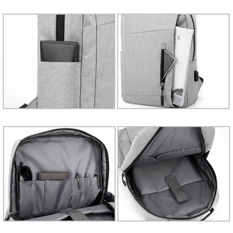 This men's backpack is designed for business use with its waterproof material and multiple functions. It features a portable and casual design suitable for daily use. The backpack also includes a USB charging port for added convenience.