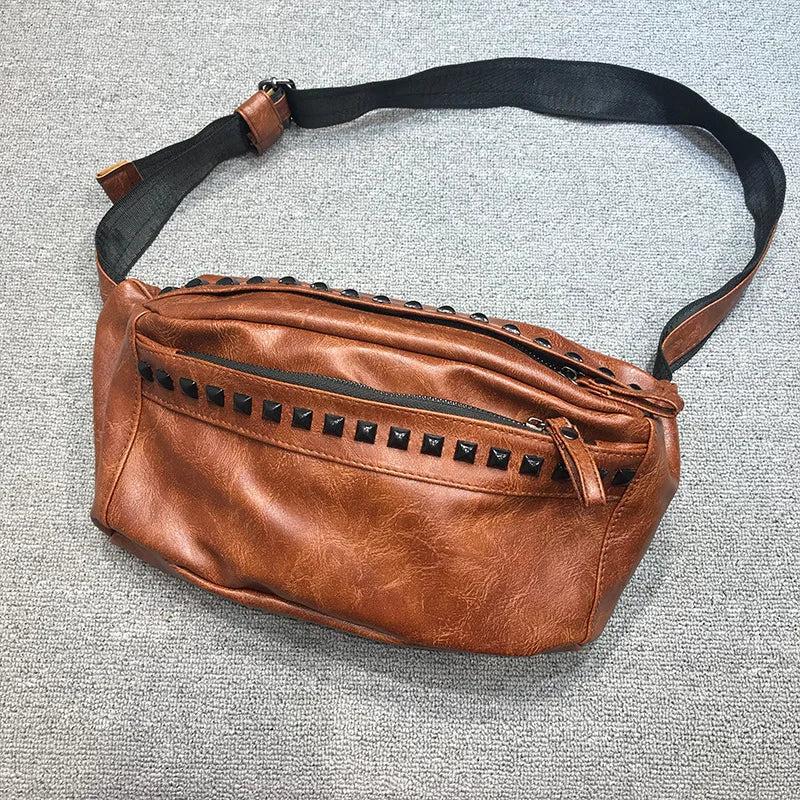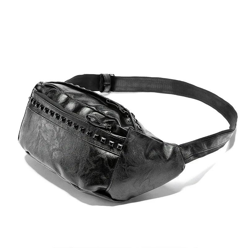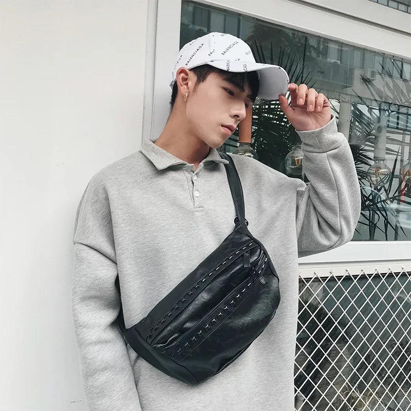 This men's chest bag features rivet decoration and a versatile design, suitable for both casual and formal occasions.