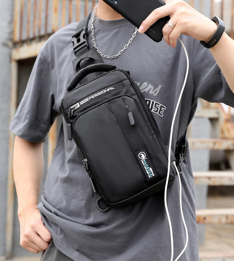 This compact backpack is designed for men on-the-go. It features a USB charging port for convenient charging while traveling. Made of durable nylon, this sling messenger bag is perfect for daily use.