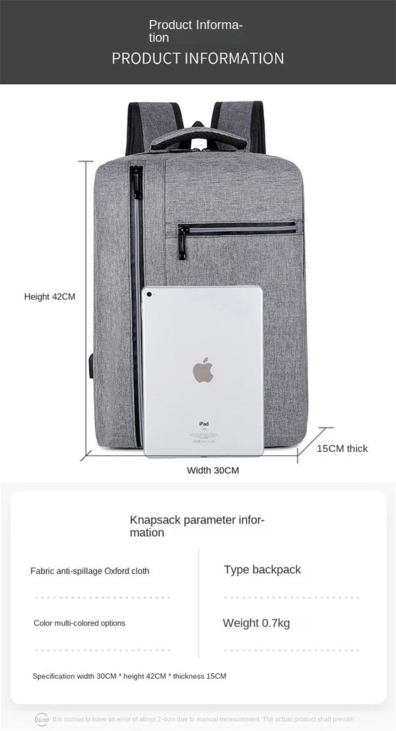 Description:This men's backpack is made of waterproof Oxford cloth and features a USB charging port. It's perfect for business travel with its reflective strip.Features: Waterproof Oxford cloth construction USB charging port for convenient device charging Ideal for business travel and daily use Reflective strip for added safety in low-light conditions...