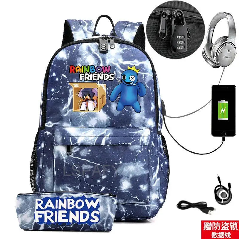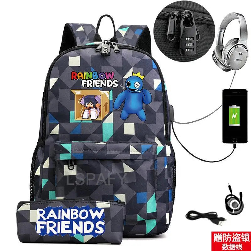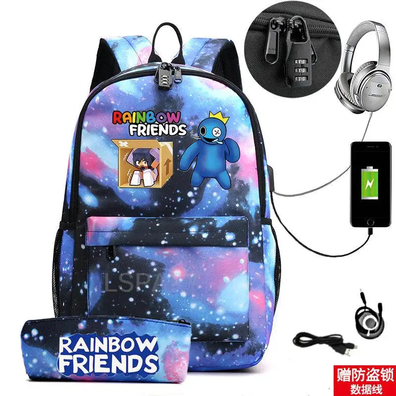 This colorful rainbow backpack is perfect for school students. It is made of durable canvas material, waterproof, and features an anti-theft design with a USB charging port.