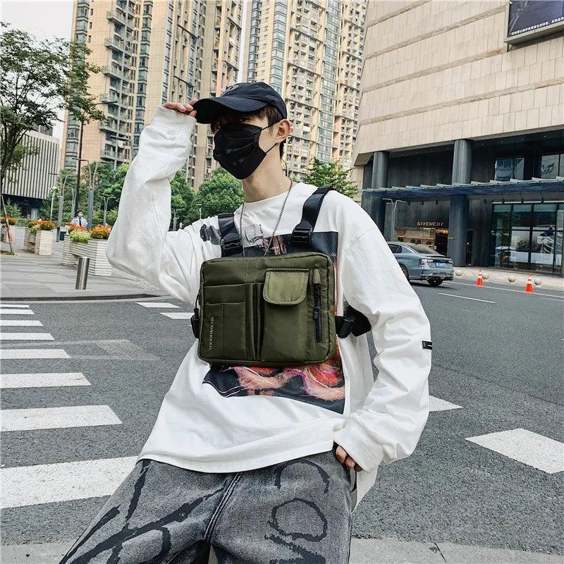 Stay functional and stylish with this vintage hip hop tactical shoulder bag. Perfect for urban streetwear outfits, this adjustable chest vest bag offers a blend of fashion and functionality.