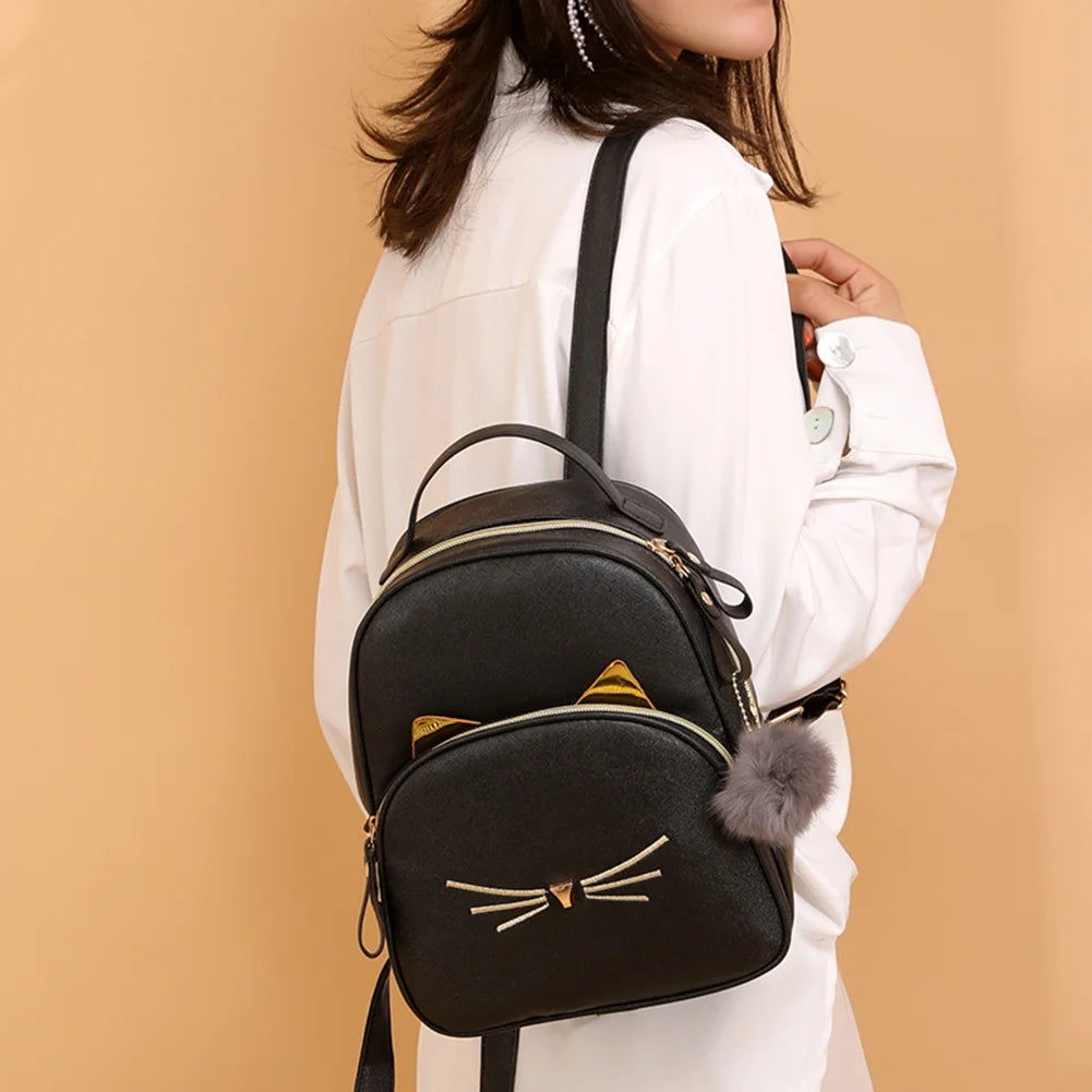 Teenagers Backpack PU Leather School Bags Girl Cartoon Cat Square Satchel