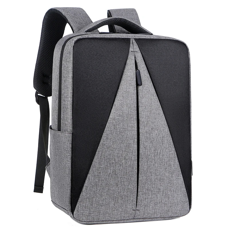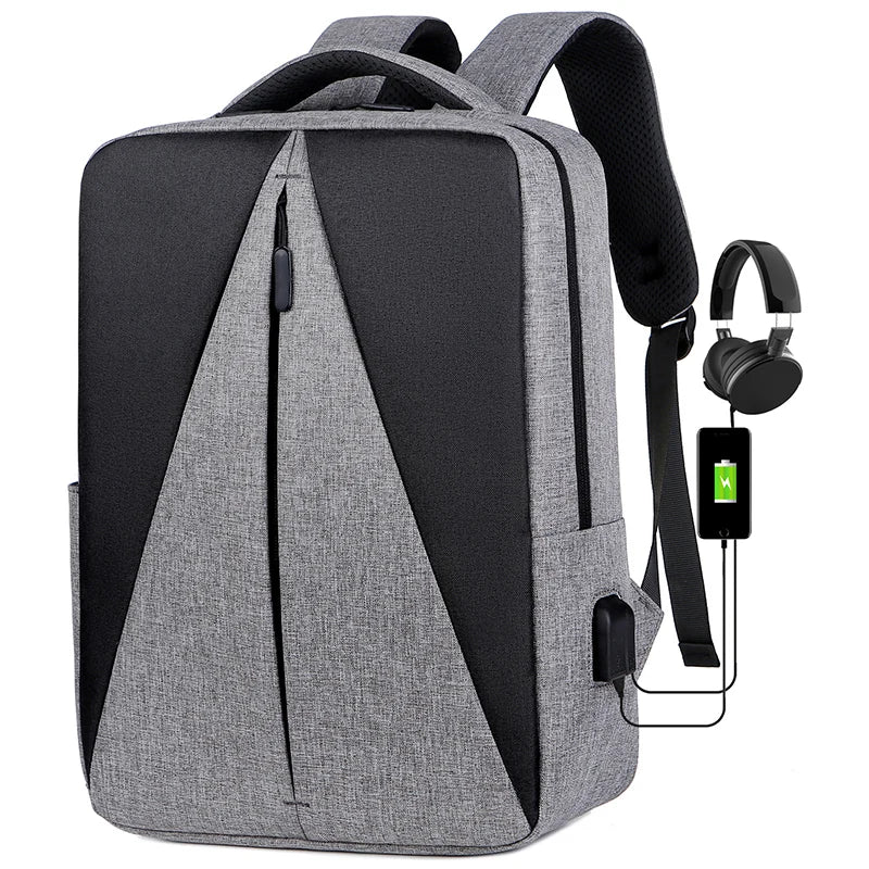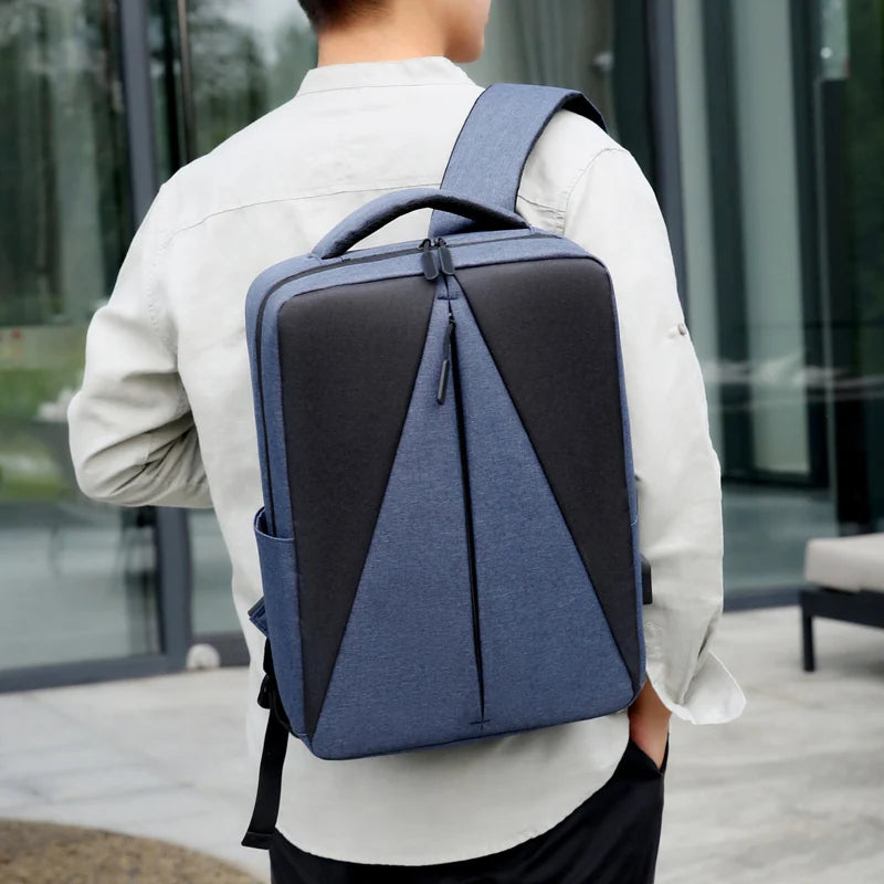 This backpack features a unique triangle splicing design, suitable for men. It has a large capacity and can fit a 15.6-inch laptop. Perfect for school or everyday use.