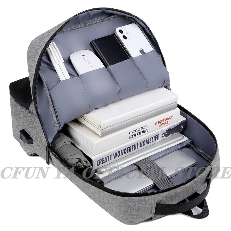 This backpack is designed for male students and business professionals. It features a USB port for convenient charging on the go.