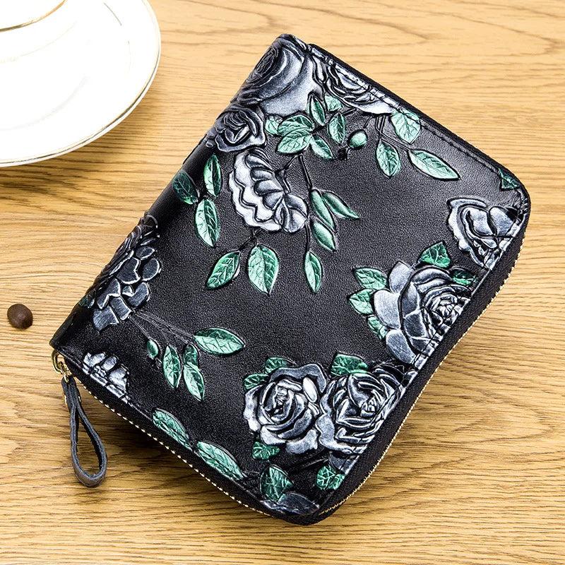 This ladies' short wallet features a beautiful plant flower and dragonfly design. It has a zipper closure and is perfect for storing cash, cards, and passport. Made of high-quality leather, this wallet exudes elegance and style.