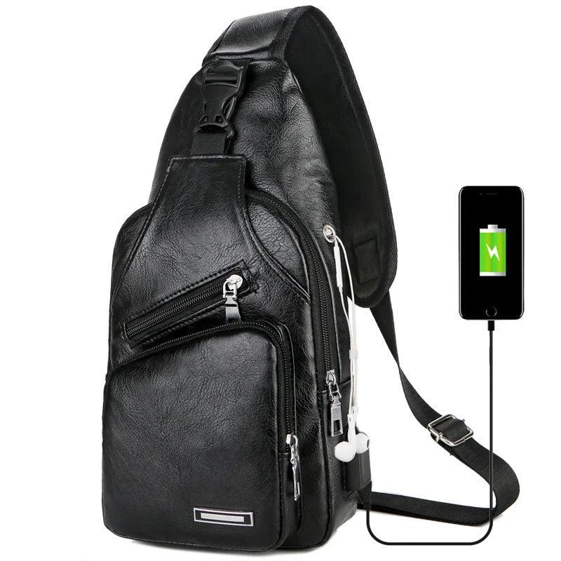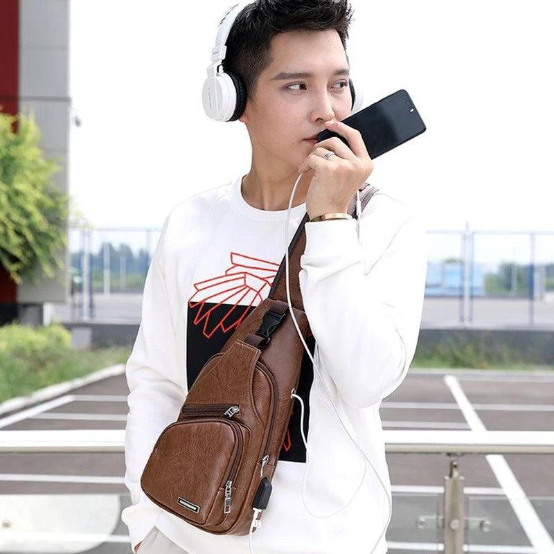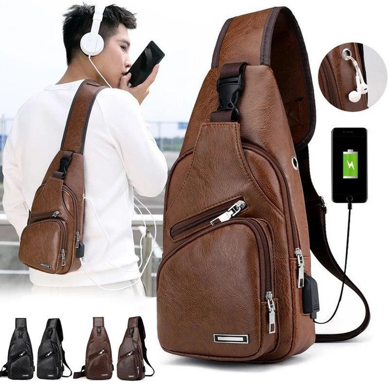 This men's shoulder bag is a versatile and practical accessory made of durable canvas material. It features a charging port for convenience during outdoor activities and has multiple compartments for organized storage.