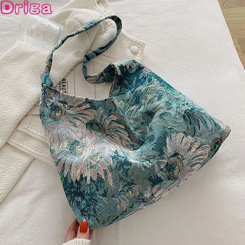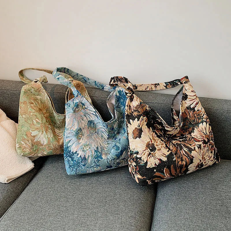 Portable Oil Painting Style Shoulder Bags For Female Canvas Underarm Handbags