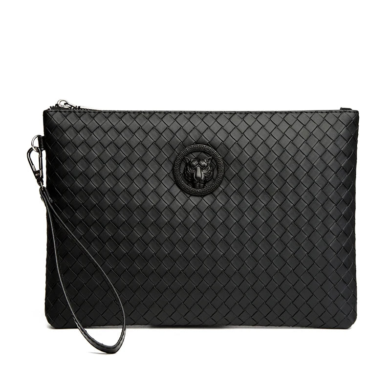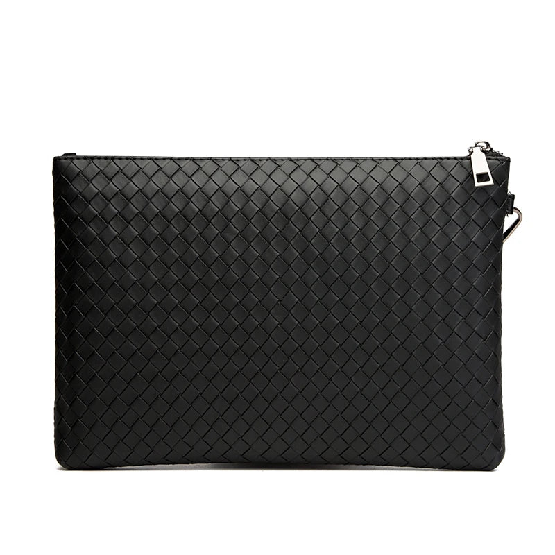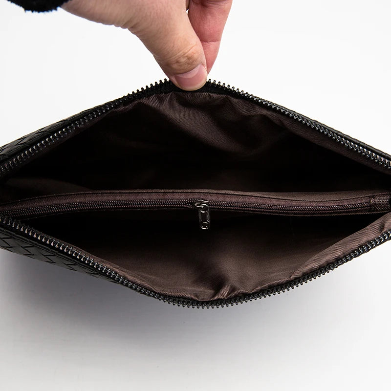 This men's envelope wallet handbag is crafted from high-quality woven PU leather, making it durable and stylish. It includes a shoulder strap for easy carrying.