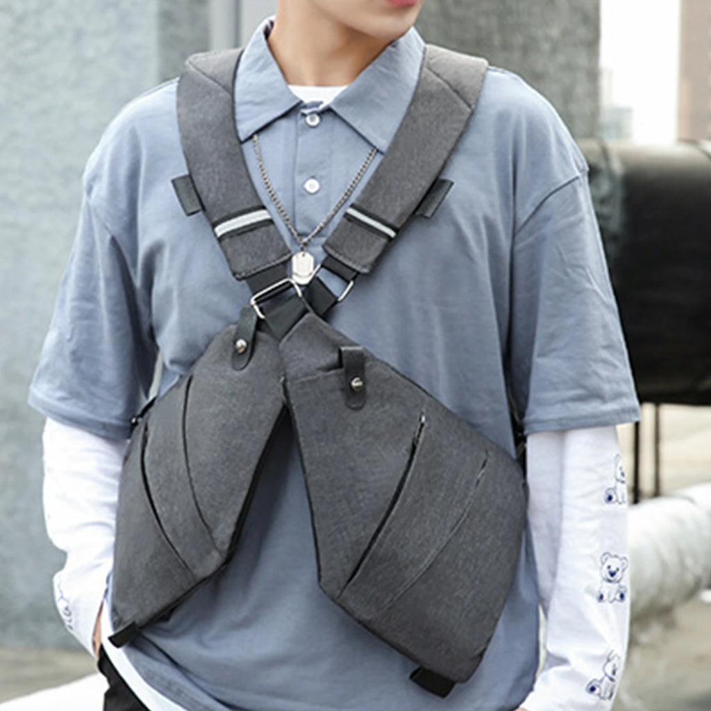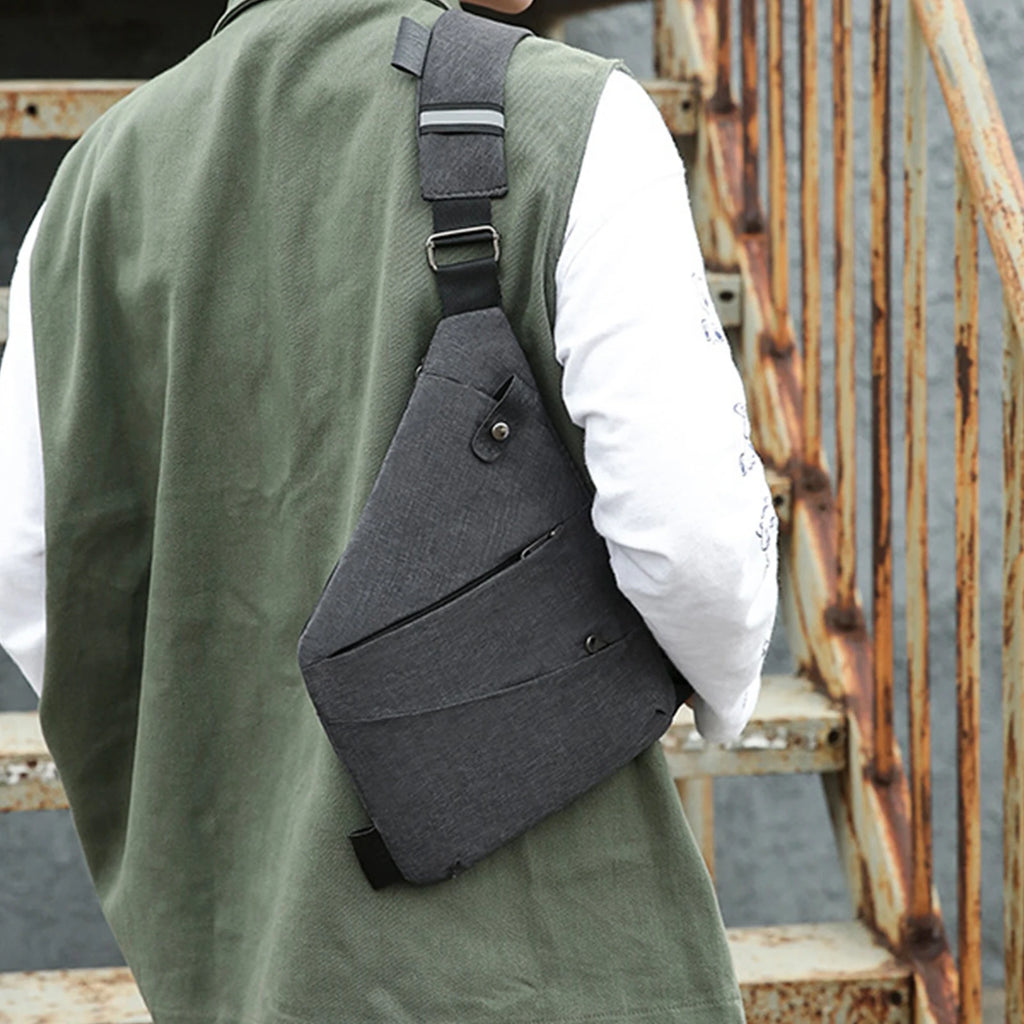 This chest bag is designed for men, featuring anti-theft properties and waterproof material, perfect for travel and sports.