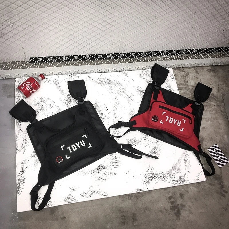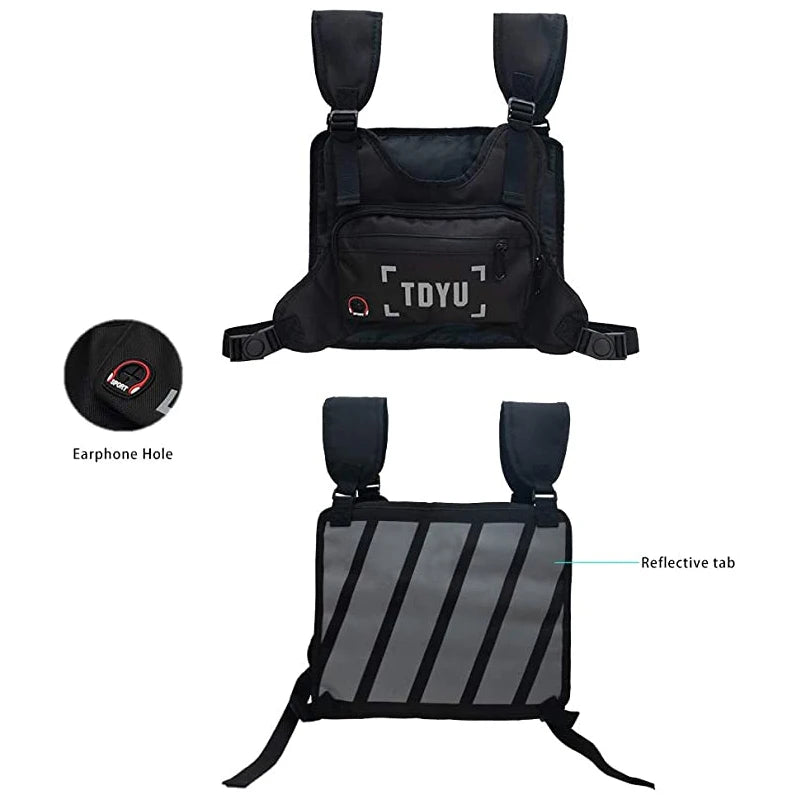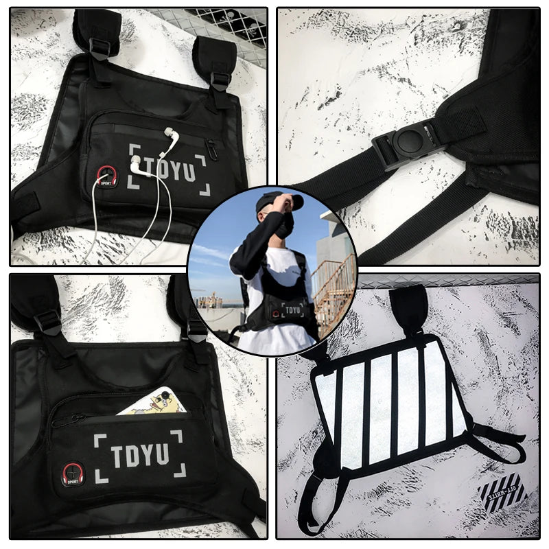Stay stylish and organized with this hip-hop streetwear chest rig bag. Designed for outdoor activities, it features a small phone pouch and a reflective strip for visibility. The disco strap adds a trendy touch to your look.
