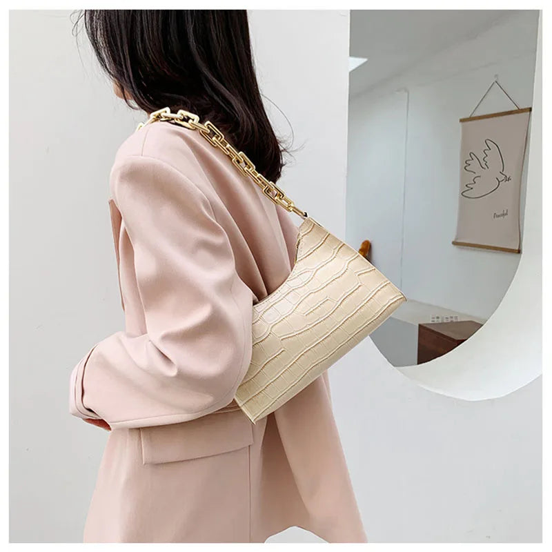 Elevate your style with this chic crocodile pattern underarm bag featuring a chain shoulder strap. Perfect for spring and summer outfits.
