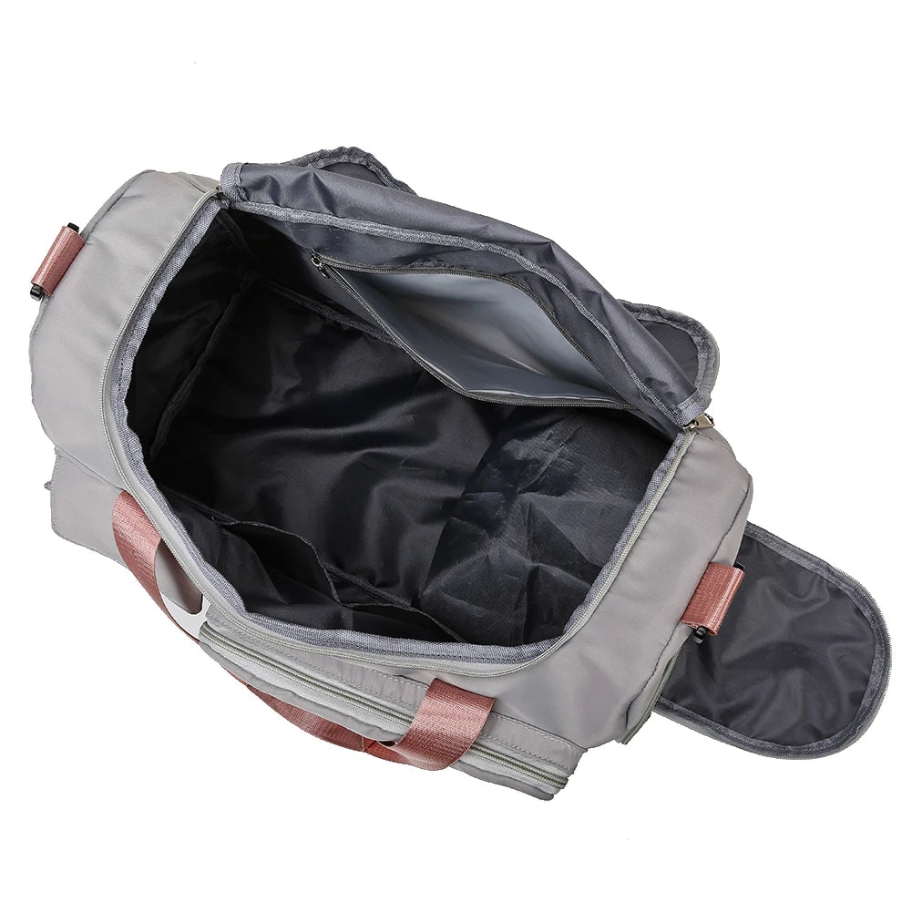 This travel duffel bag is perfect for swimming, hiking, and camping trips. It features a shoes compartment and is foldable for easy storage.