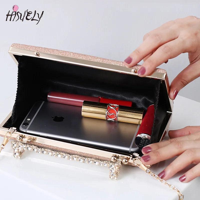 Elegant handbag adorned with sparkling diamond ornaments, perfect for parties, dinners, weddings, or special occasions. Can be worn as a shoulder bag or with the chain strap.