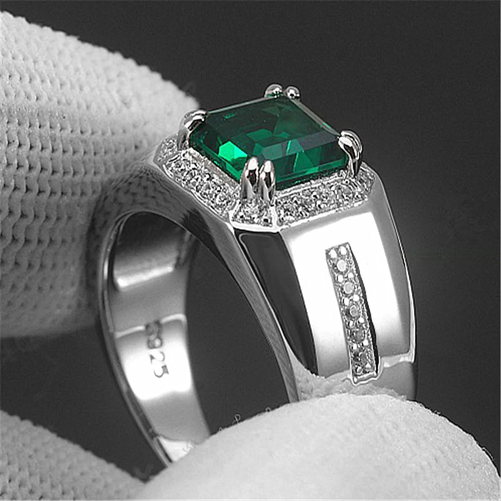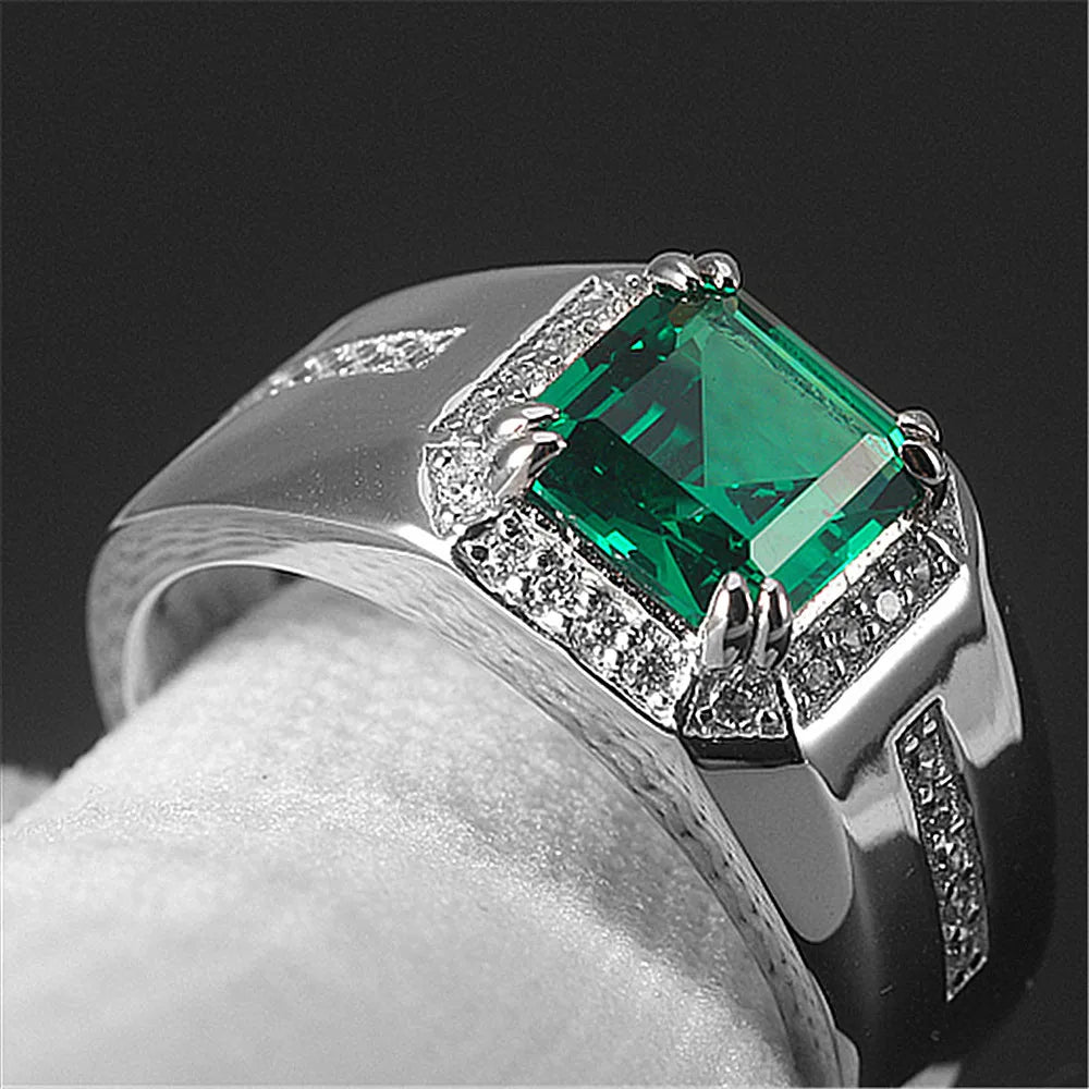 Green Emerald Crystal Men's Wedding Band Silver Jewelry