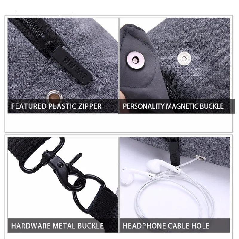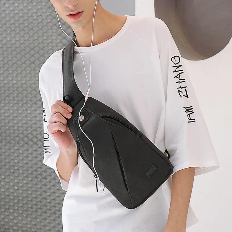 This men's sling bag is designed for travel, featuring an anti-theft design and waterproof material. It is a slim chest bag ideal for carrying essentials.