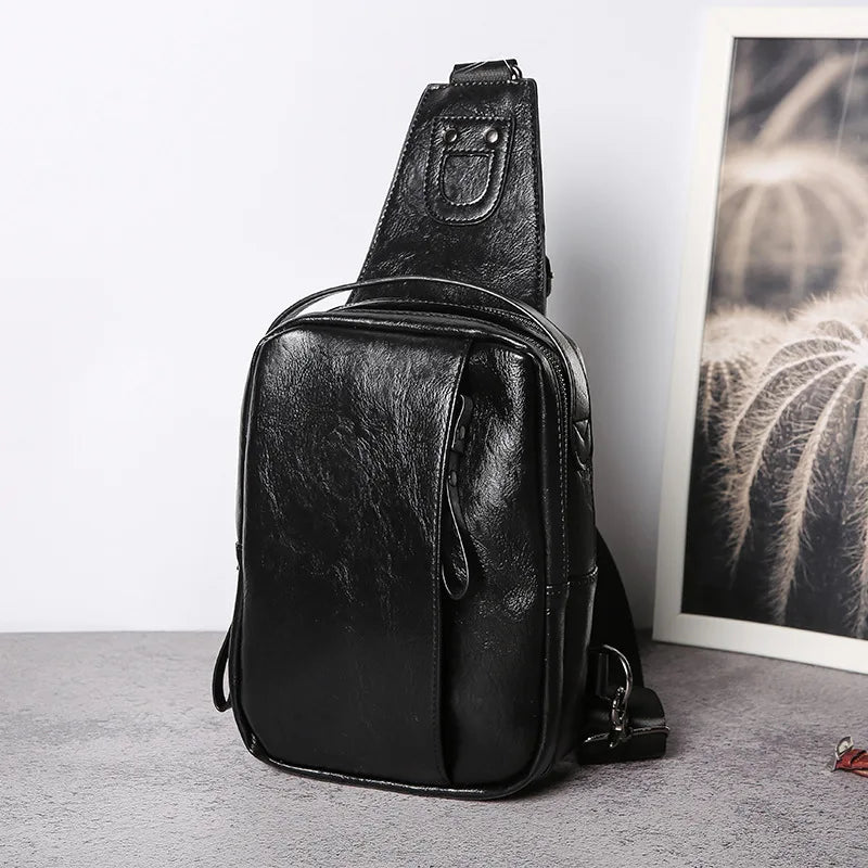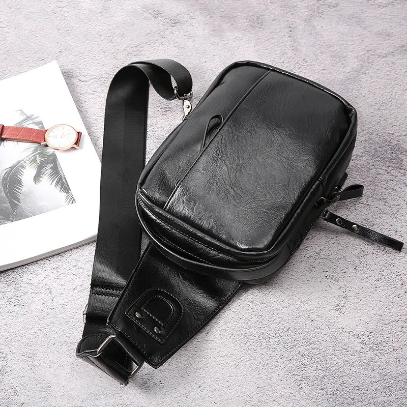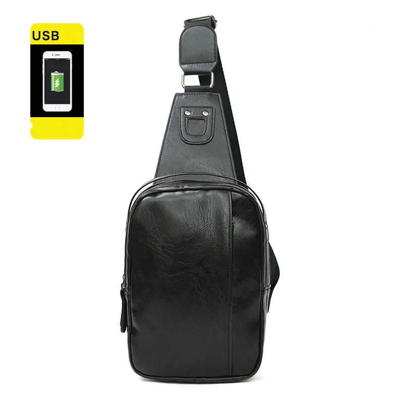 This men's chest bag is made of high-quality PU leather, perfect for sports or casual wear. It features a USB interface for convenient charging on the go.