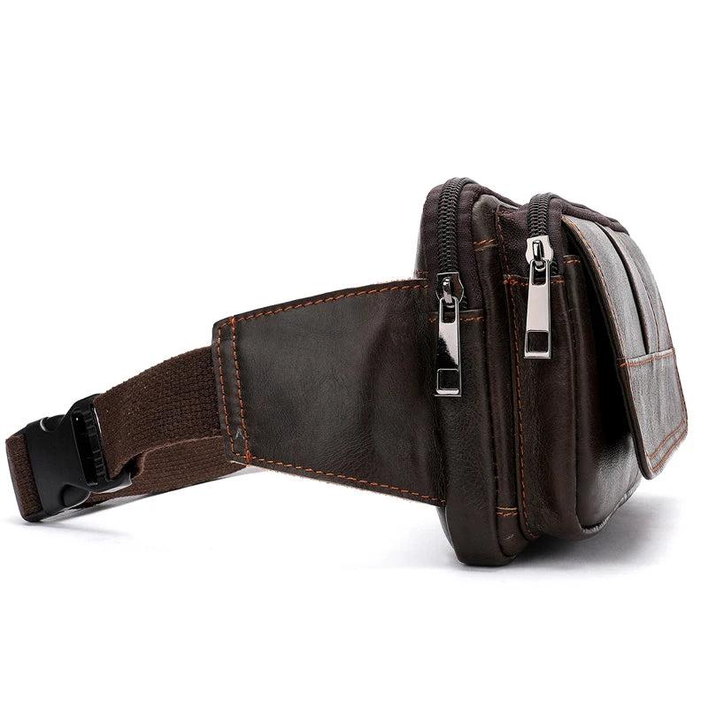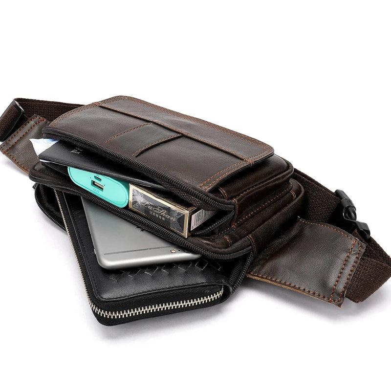 This men's leather waist bag is made of top cowhide leather, perfect for carrying your essentials. It features multiple compartments and can be worn as a shoulder or crossbody bag.