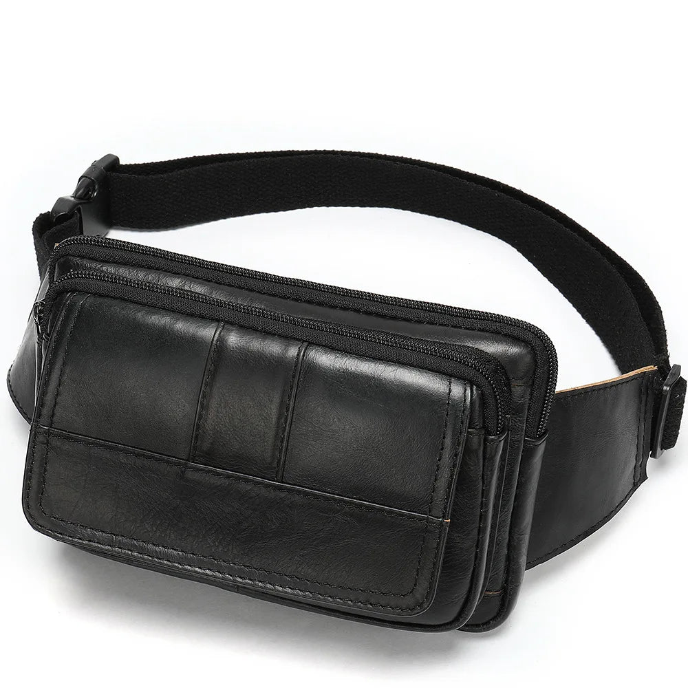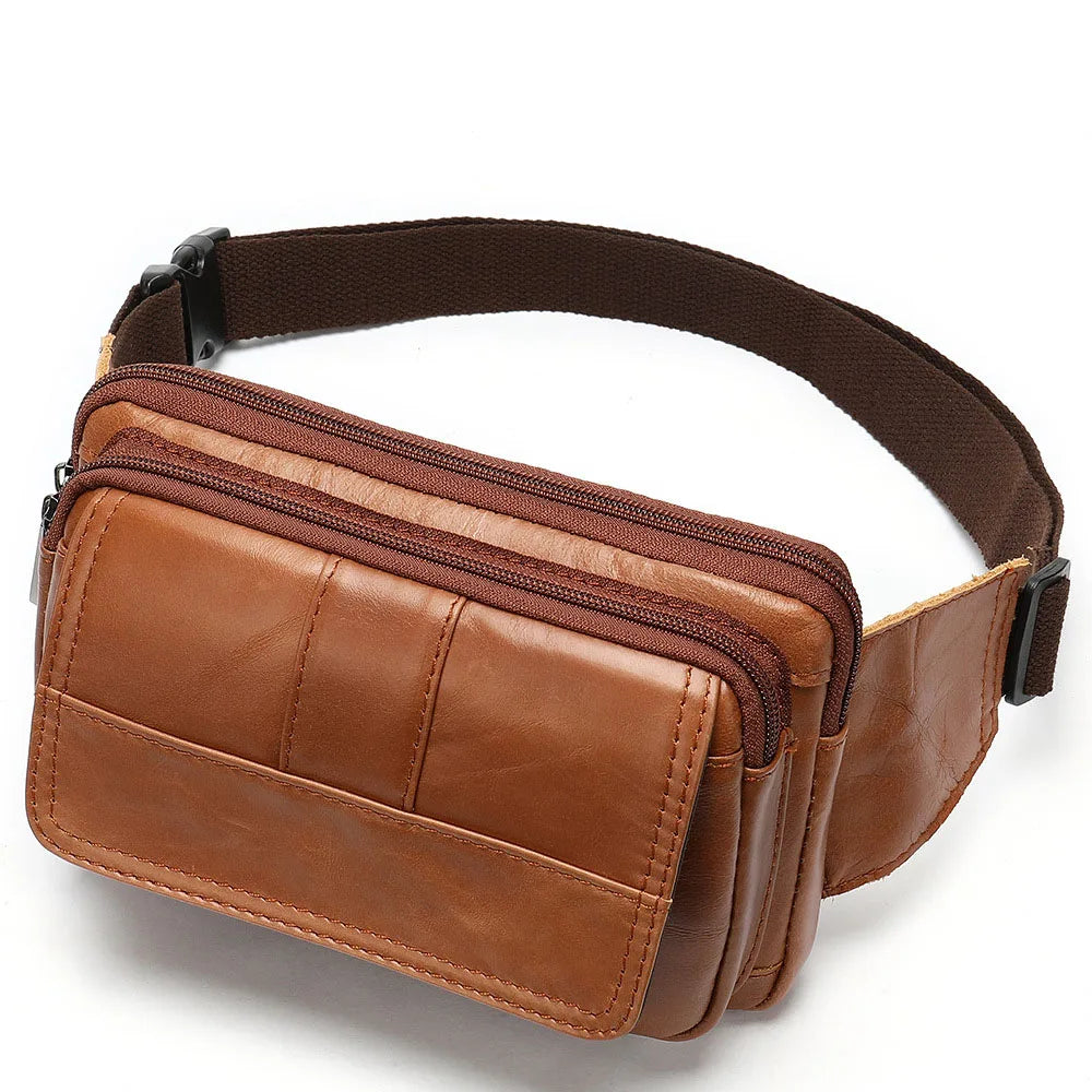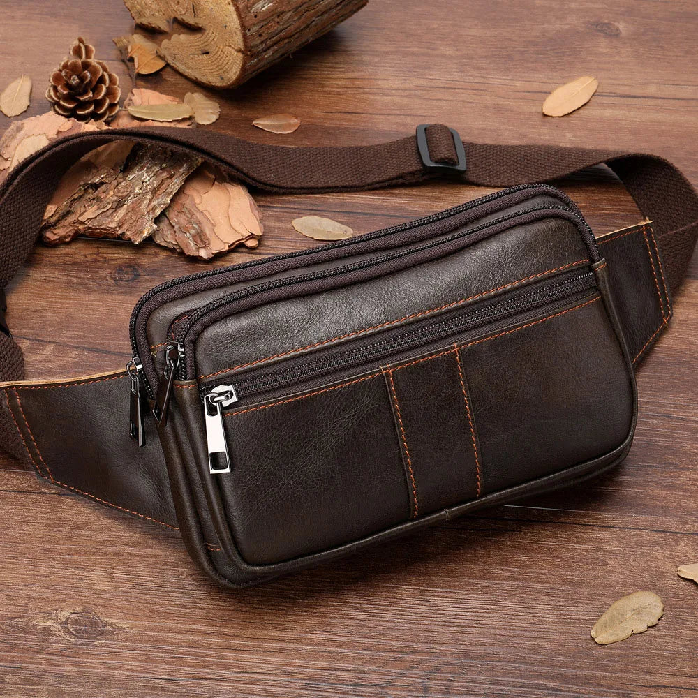 This waist bag is made of high-quality leather, perfect for outdoor activities. It features multiple pockets and a retro design.
