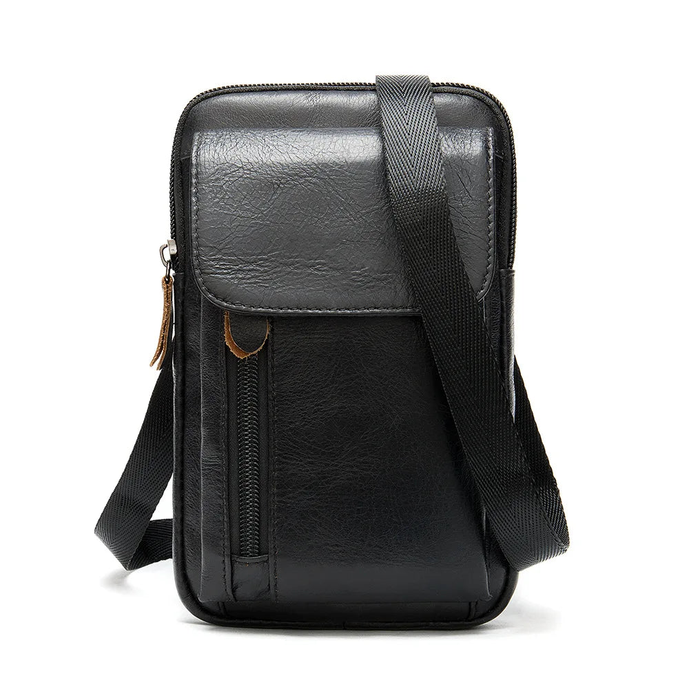 This men's leather waist bag features a retro design with a versatile shoulder strap and belt. It includes a 6.5-inch cell phone pocket for convenience.