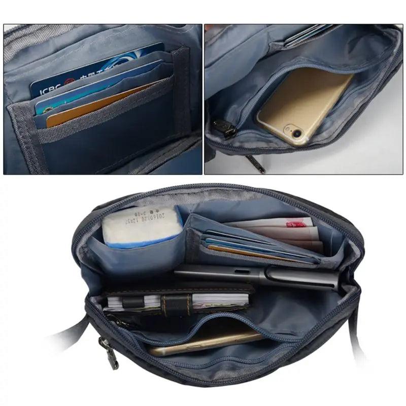 Stay organized on-the-go with this versatile nylon belt bag featuring multiple compartments. Can be worn as a waist pouch or crossbody shoulder bag.