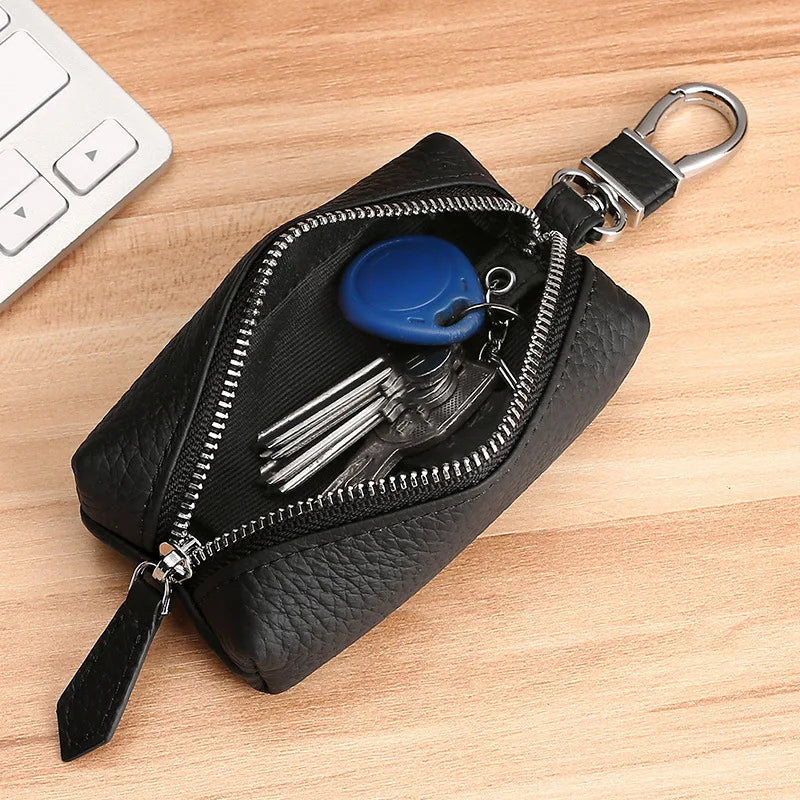 This cowhide top layer leather case is perfect for holding small items such as keys or coins. The zipper closure ensures your belongings stay secure. The hook style allows for easy attachment to your bag or belt loop. Ideal for both men and women.