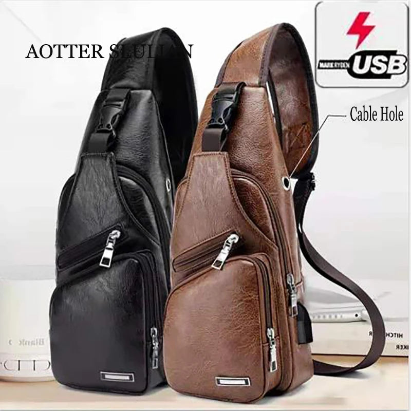 Men's Crossbody Phone USB Charging Bag Leather Shoulder Anti-theft Travel Pack
