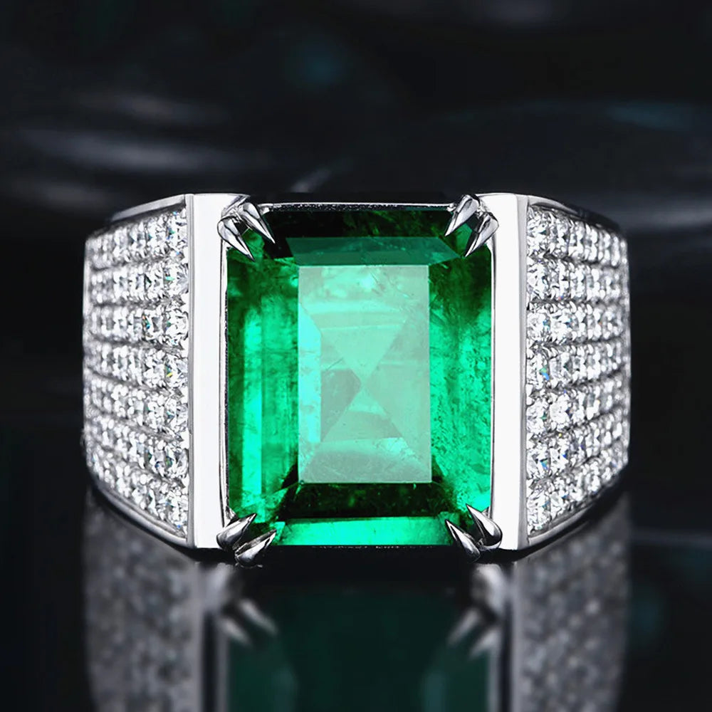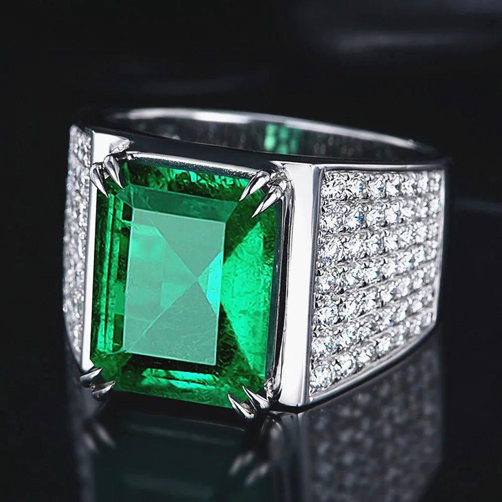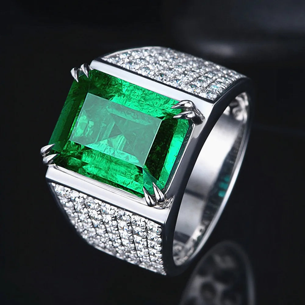 Men's Green Emerald Crystal Ring Silver Jewelry