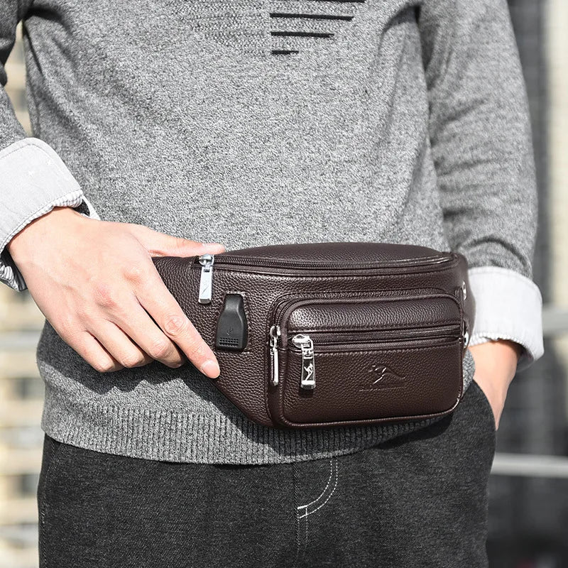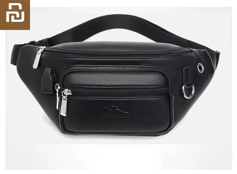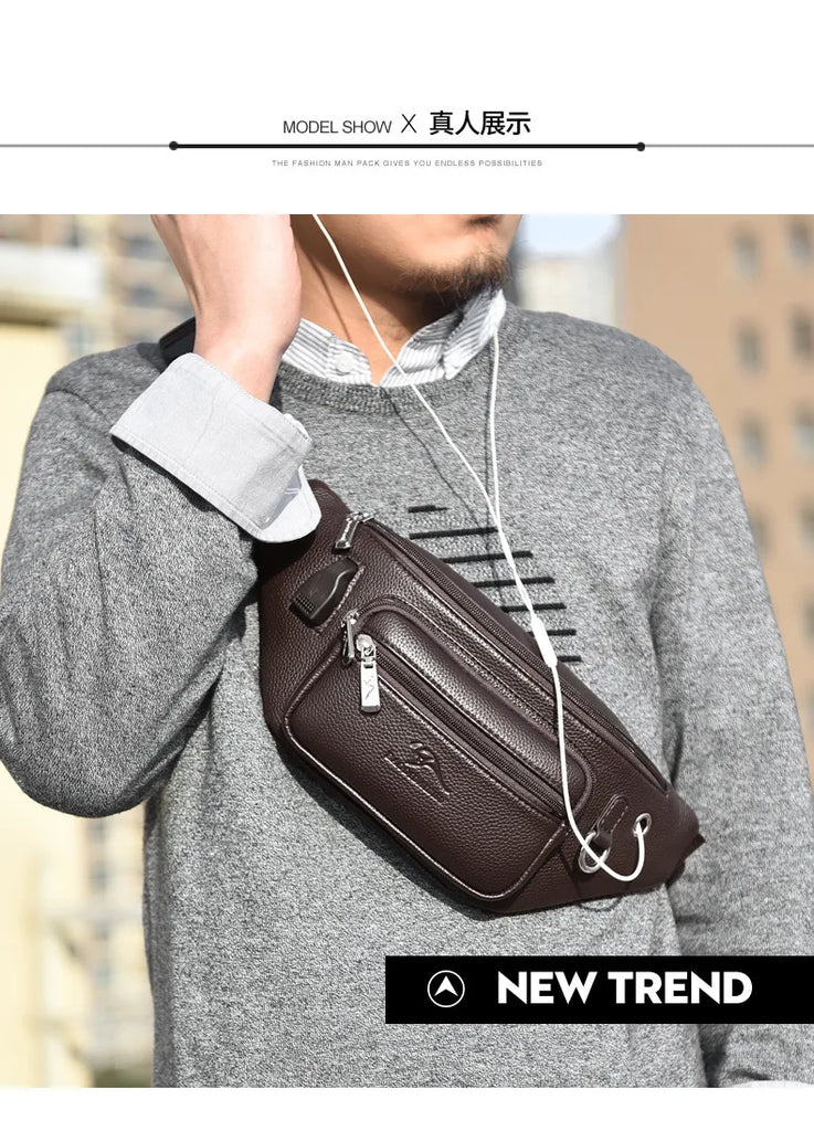This men's waist bag is designed for sports and leisure activities. It is waterproof, features a USB charging port, and can be worn as a crossbody shoulder bag.